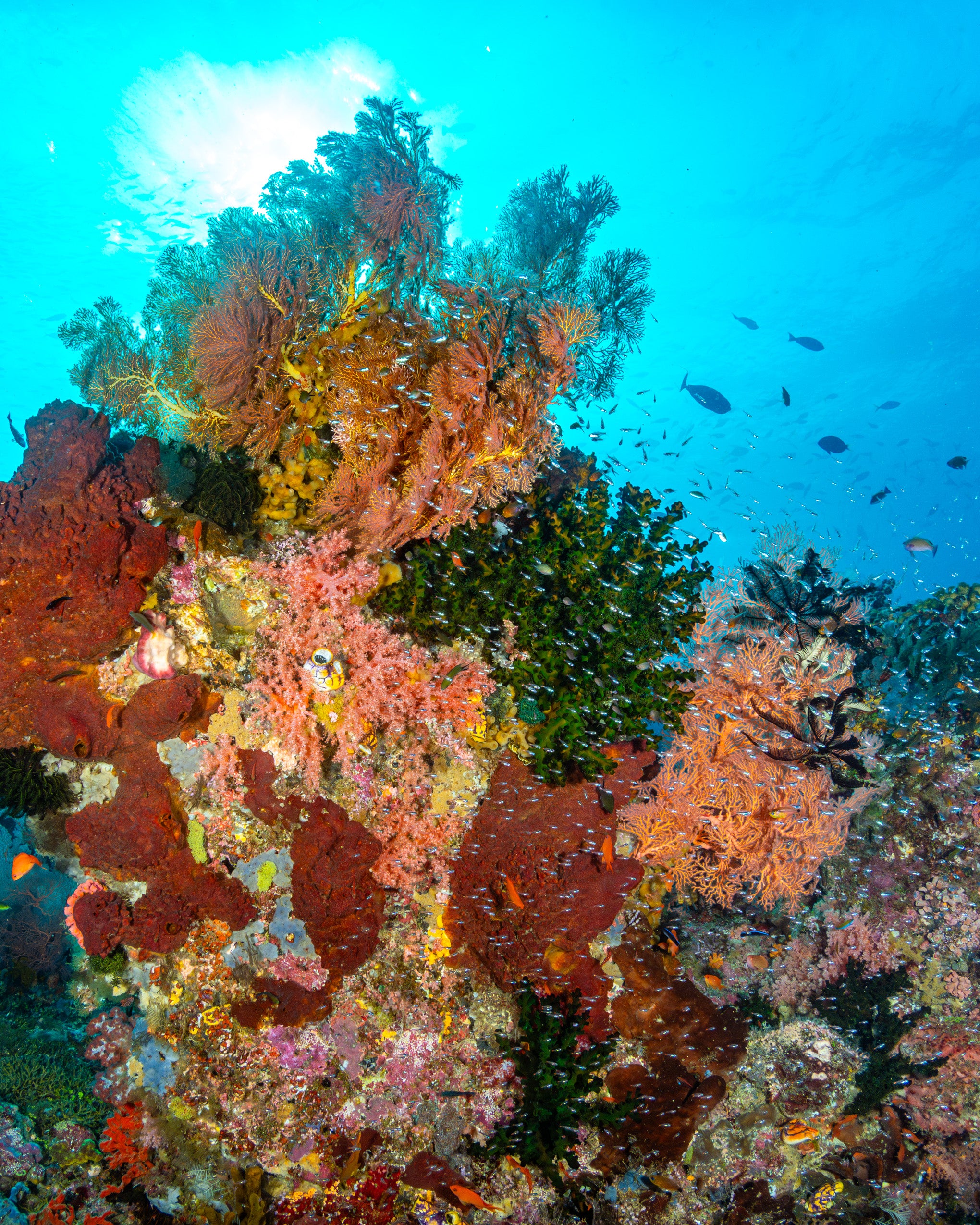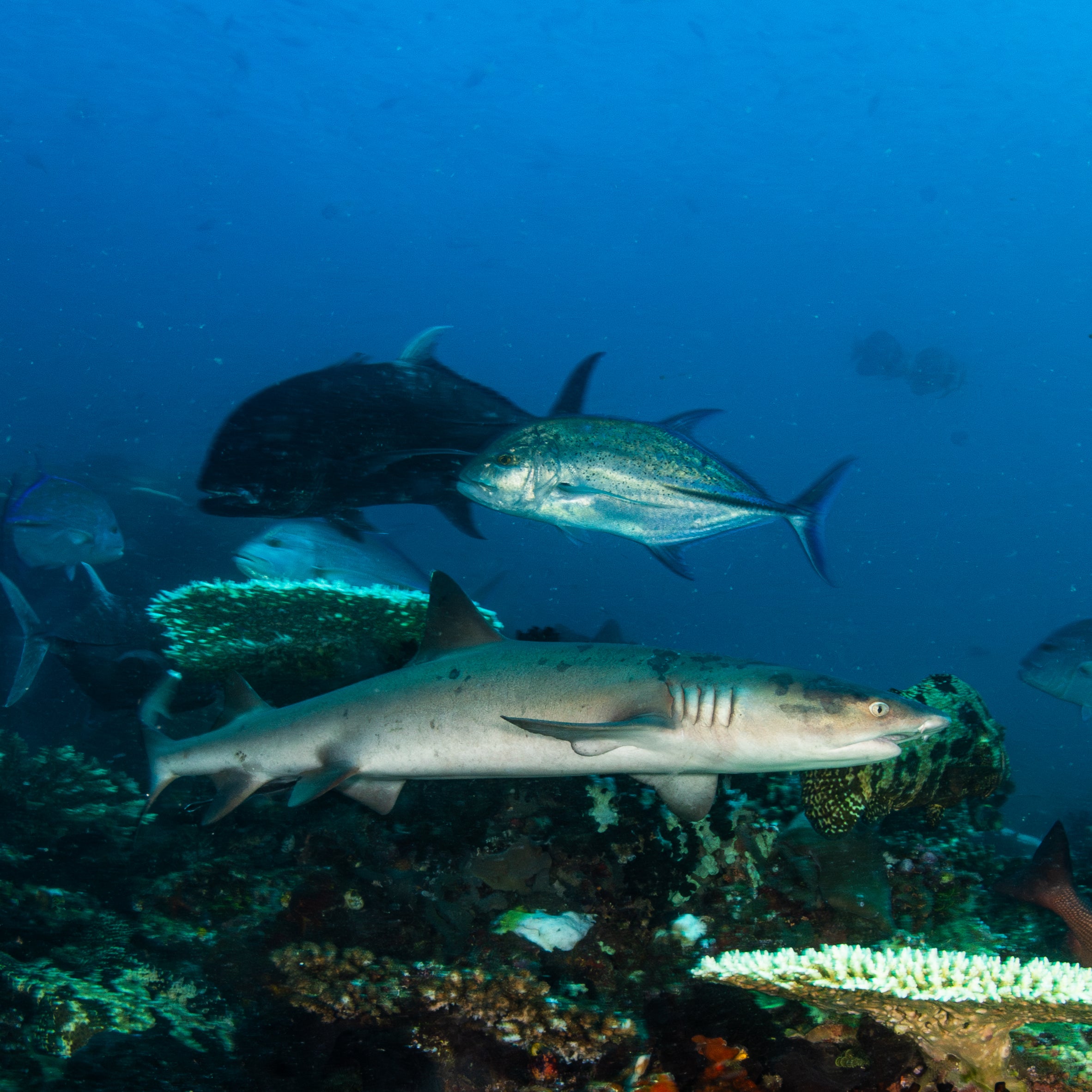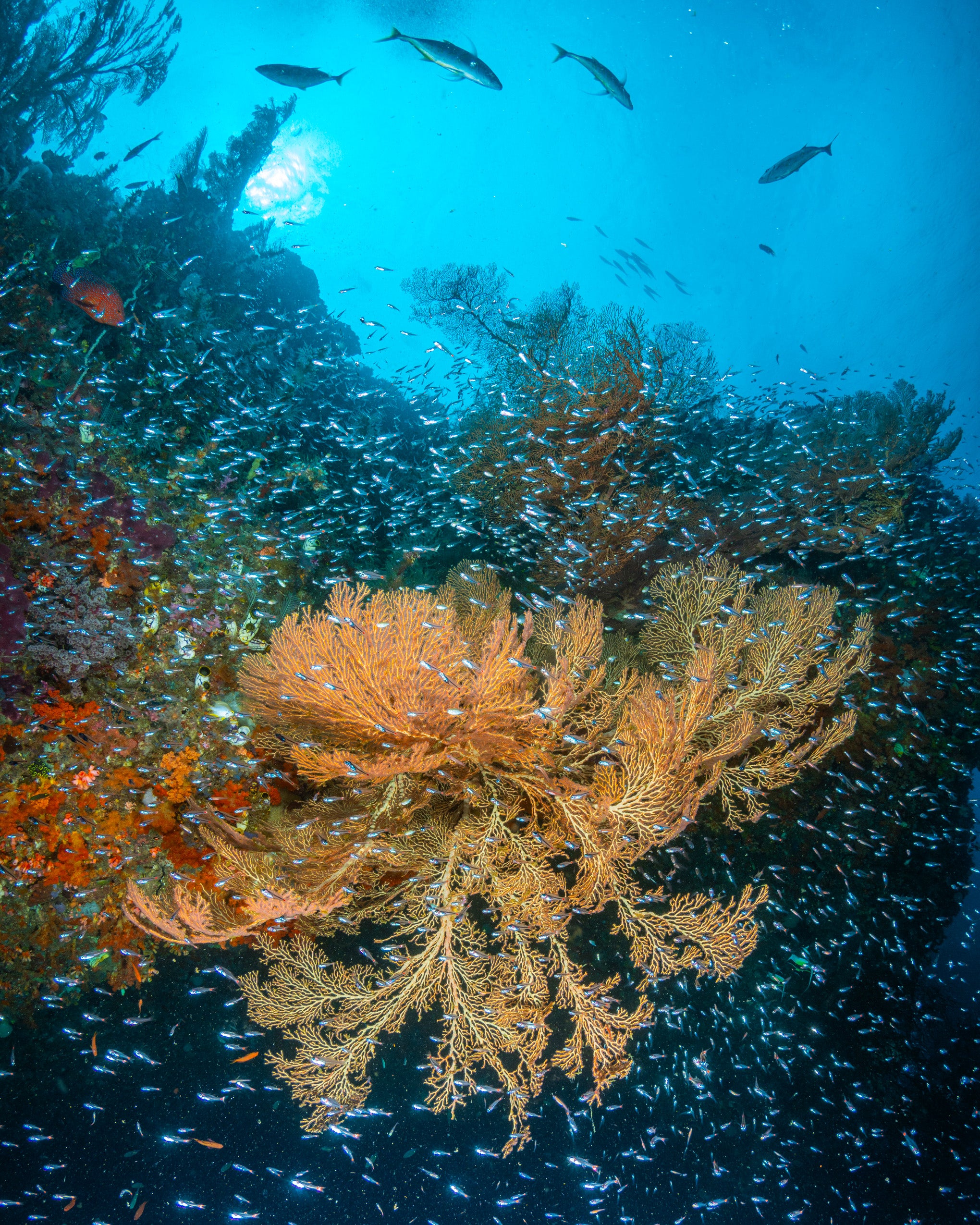 Shallower up on the reef top, divers are met with a spectacle of schooling fish gliding above healthy coral gardens — a stunning finale to an unforgettable dive.