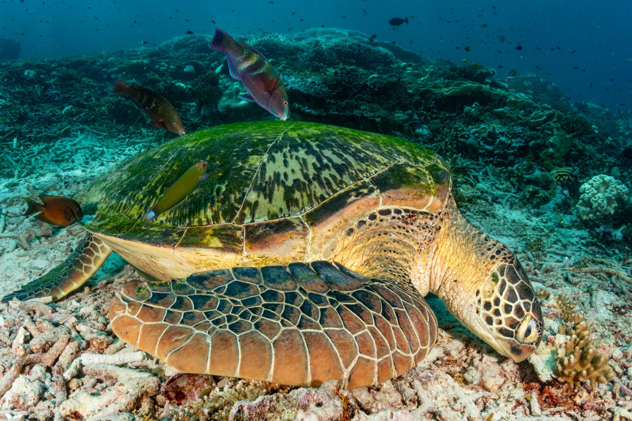 The dive features an impressive mix of healthy coral, abundant fish life, and memorable encounters with giant green turtles. In the shallows, watch as schools of jacks cruise by over the coral garden. It’s the kind of dive you’ll want to return to again and again.